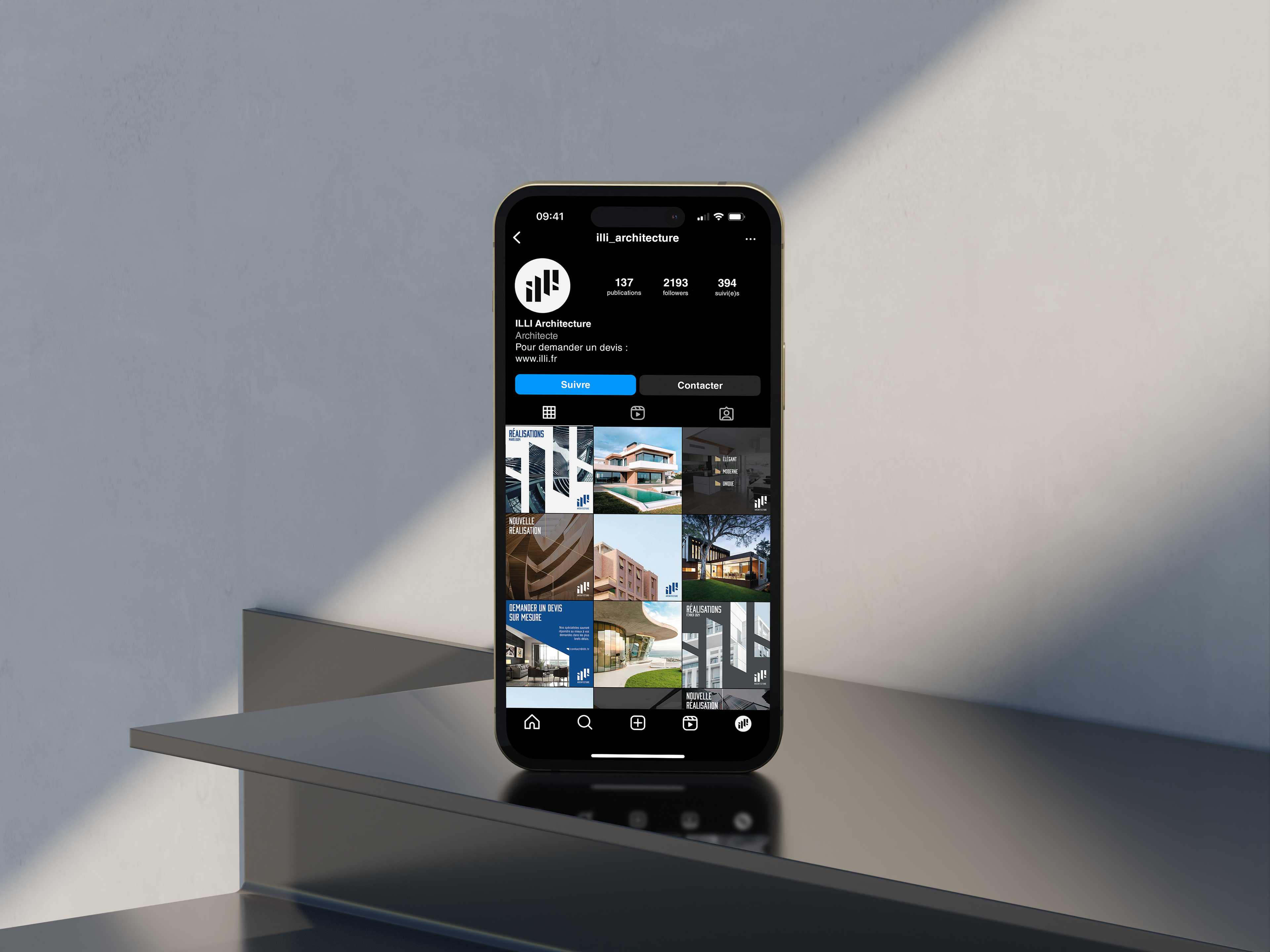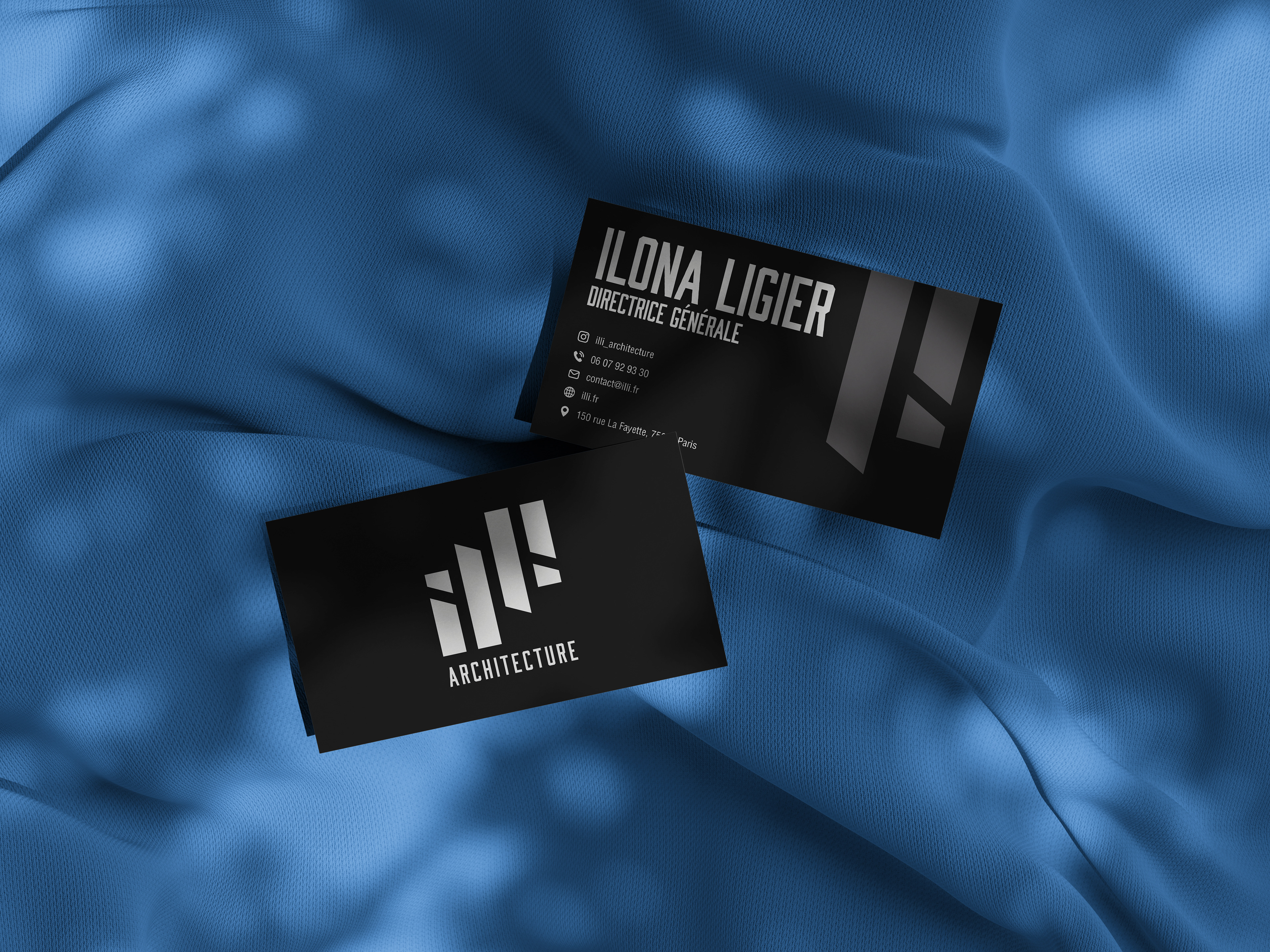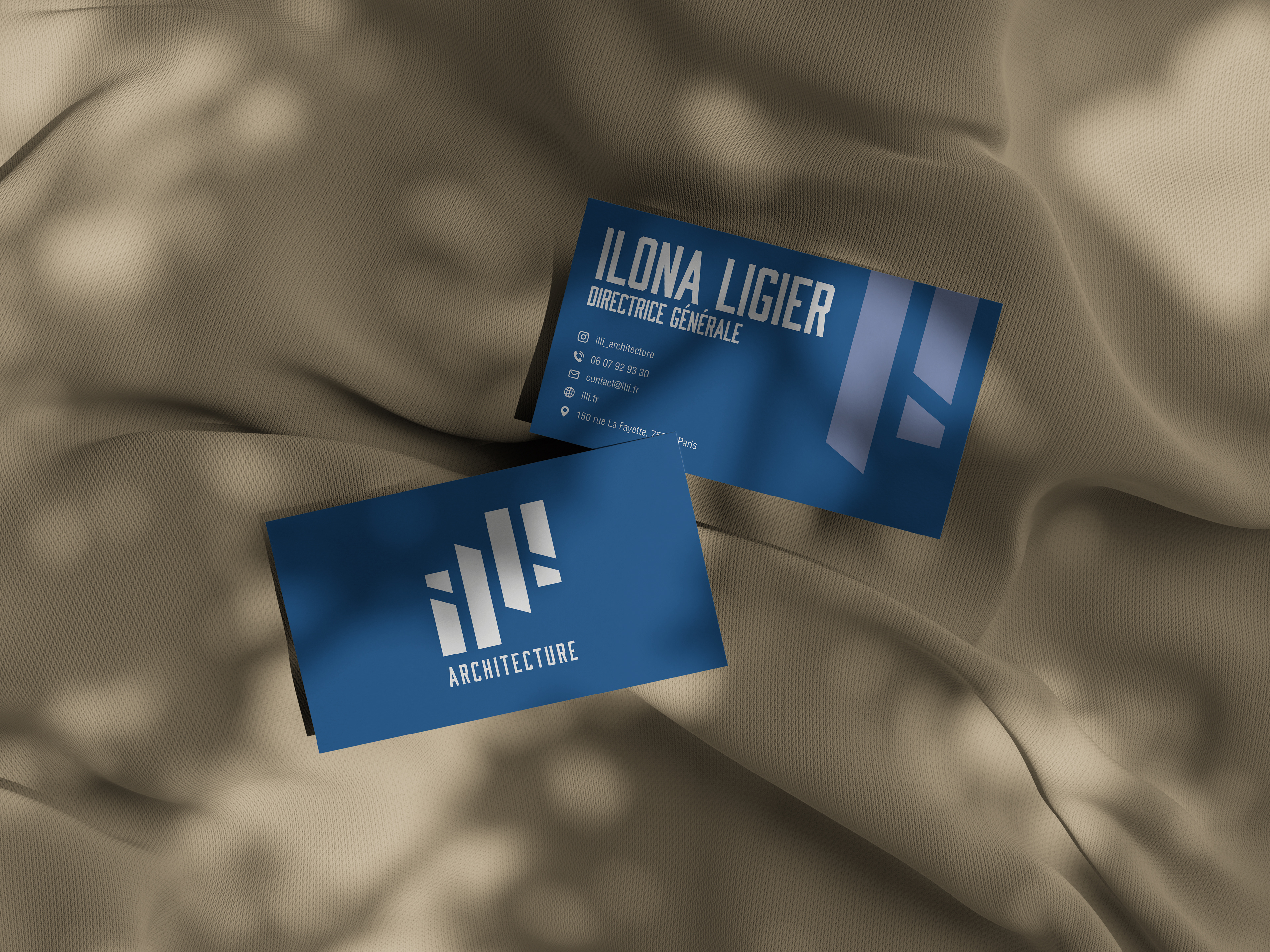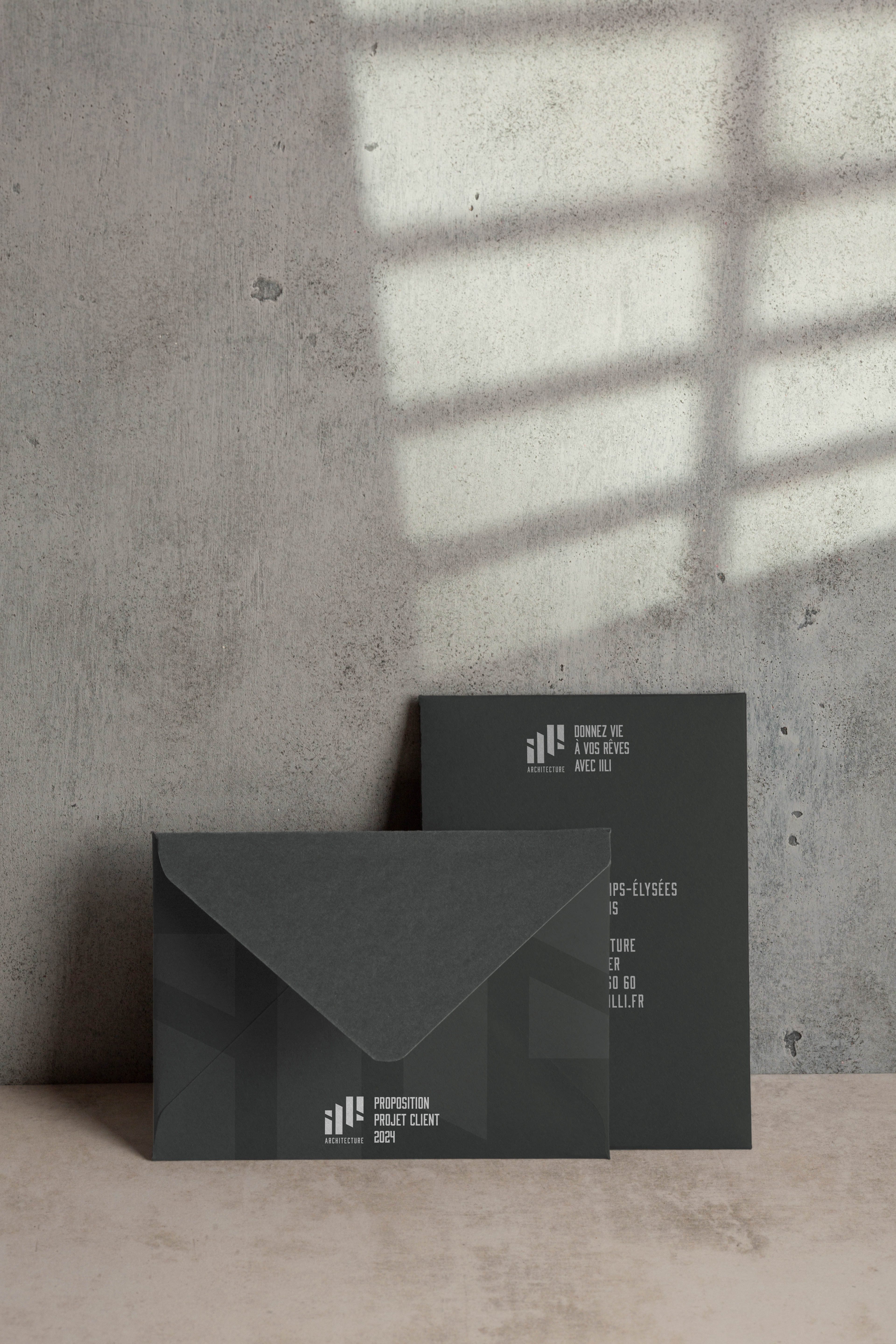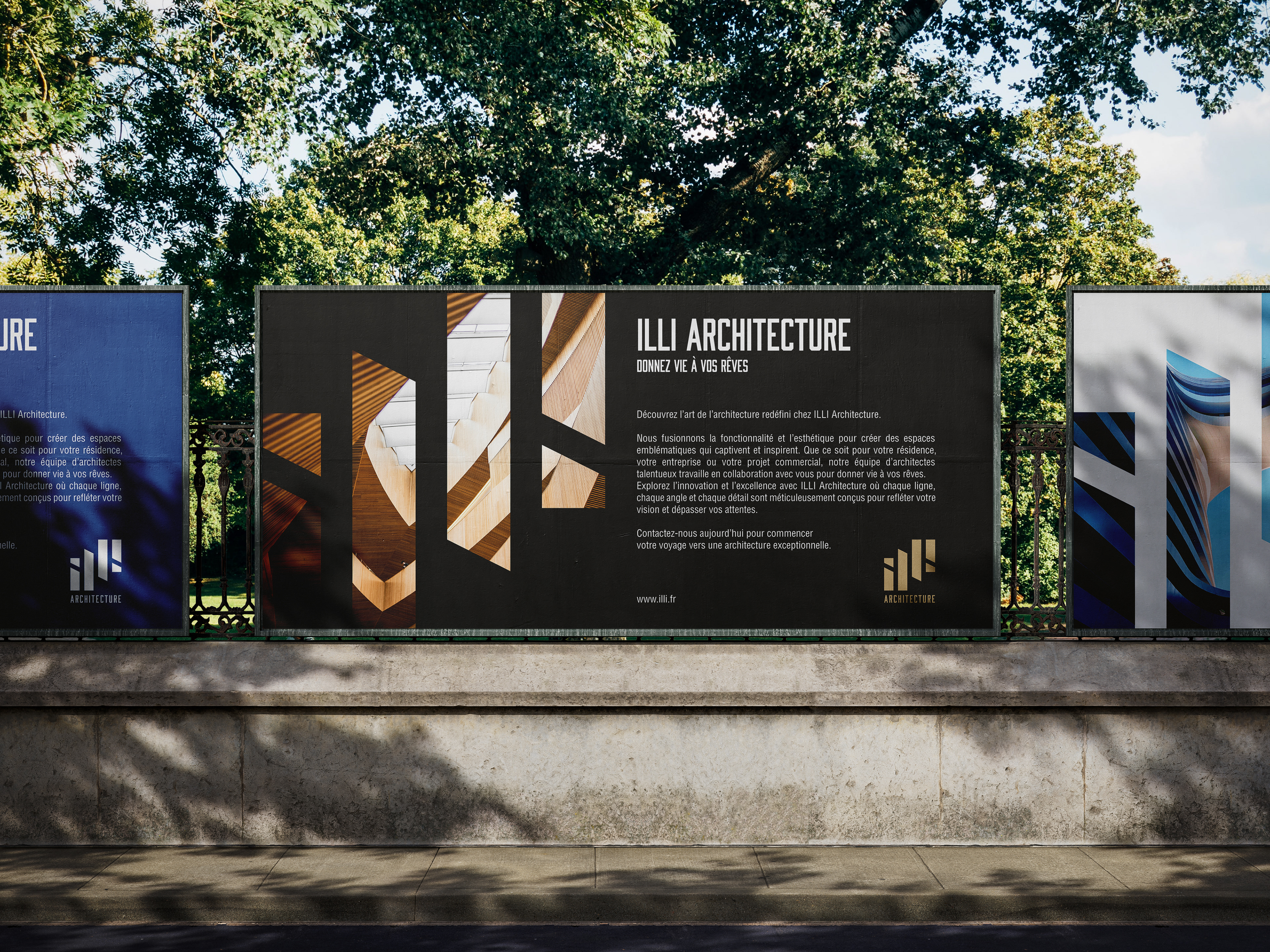 ILLI est une agence d'architecture dont le logo et les éléments visuels reflètent l'élégance et la précision de l'architecture moderne. L'ensemble vise à souligner l'expertise et la créativité de l'agence.